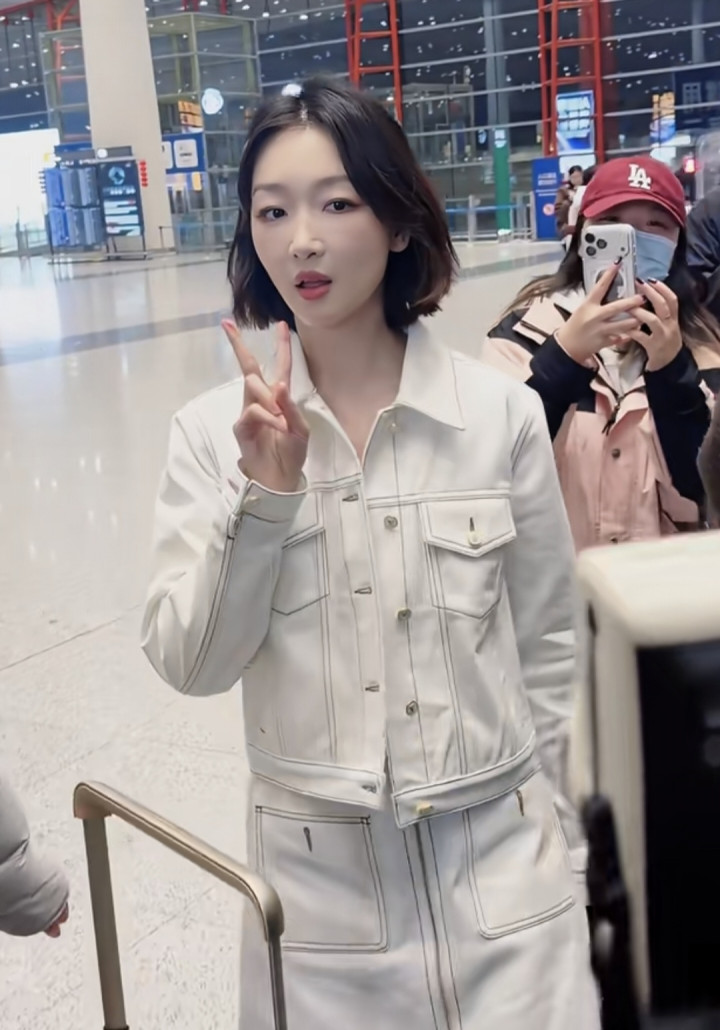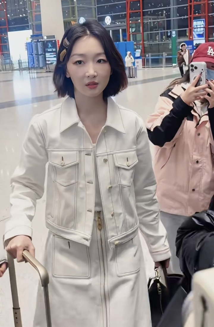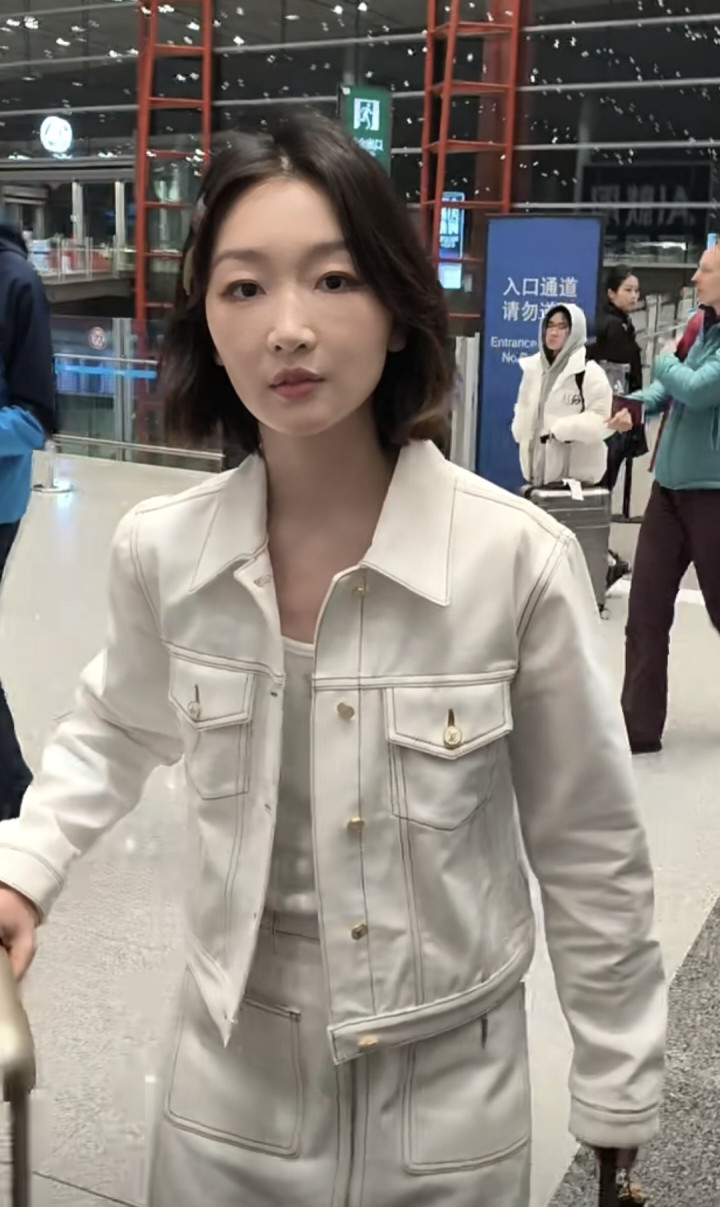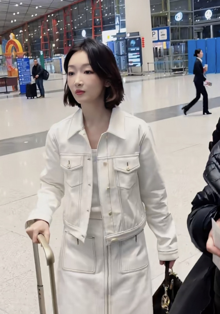 2026-03-09豪门国际app 周冬雨机场开赴, 短流配白色裙子套装, 气质